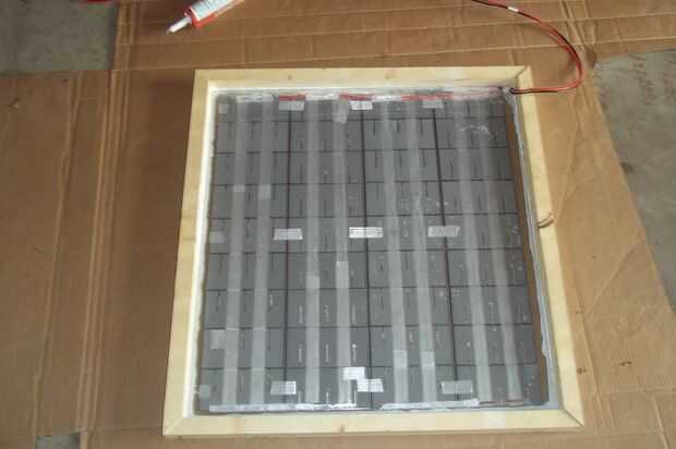 5. usando ese pedazo de madera que fue cortada de la 2 x 4 para hacer el reborde para el vidrio, cortar para poner a cada lado del marco para sostener las capas de vidrio / células y FRP al marco. Debe ser apretado, pero no tan fuerte que rompe las células.