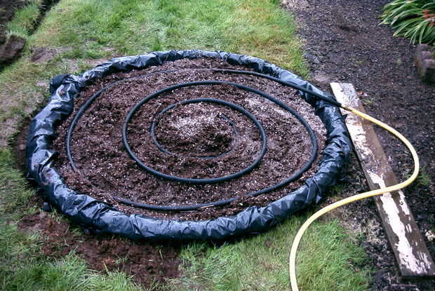 Ahora toma a tu madurador manguera y colóquelo sobre el soporte de macetas en forma de espiral. Asegúrese de que el avance extremo de la manguera está en el borde de la piscina. Tratar de mantener el espacio entre los lazos incluso como sea posible, y tenga cuidado de no desplazar el espacio en que las plantas pronto estarán.