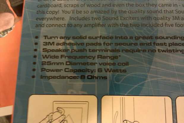 Como puede haber adivinado ya, el funcionamiento de transductores de audio puede variar significativamente, dependiendo de qué tipo de superficie están vibrando. Realmente tienes que probar diferentes superficies con el transductor antes de saltar y usar acrílico como tengo. Estos transductores están diseñados para colocarse permanentemente para cualquier superficie que aplicarlas, entonces, hacer algunas pruebas y elegir sabiamente.