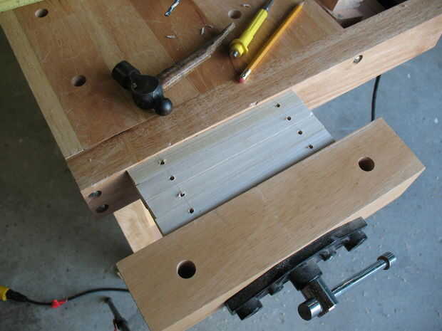 4) llevar el 1 "x 1" las piezas y taladre los orificios marcados en el tablero de partícula con un poco más pequeño que los tornillos de agarre.