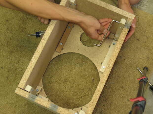 3) empotrar la caja como debe ser cuando está montado. Pone las longitudes de 1 "x 1" en sus posiciones apropiadas y luego marque donde perforar el tablero de partícula. Puede hacer esto por meter un lápiz delgado a través de los agujeros ya perforados en la 1 "x 1".