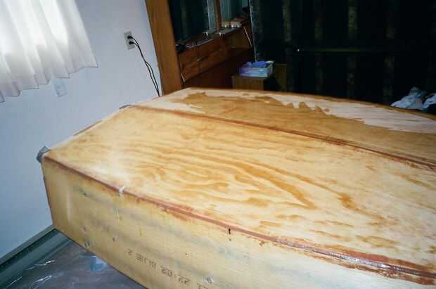 Ahora coloque una capa de epoxy en la cinta final. Tratar de trabajar a las burbujas de aire. Esto debe ser considerado como trabajos de acabado. Hacer todo lo pueda para hacer las costuras bien. Epoxi de curado está el lo más irritante del mundo para la arena y forma. La cinta de fibra de vidrio básicamente se debe ver a través. Si tienes alguna mancha todavía blancos no han mojado hacia fuera de la cinta lo suficientemente.
