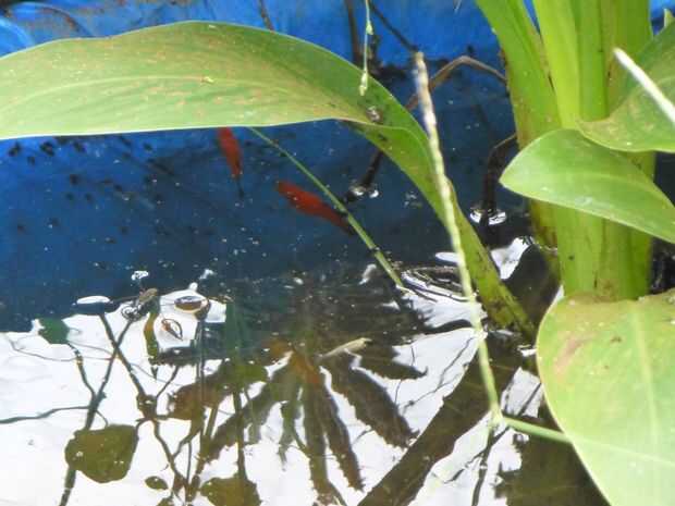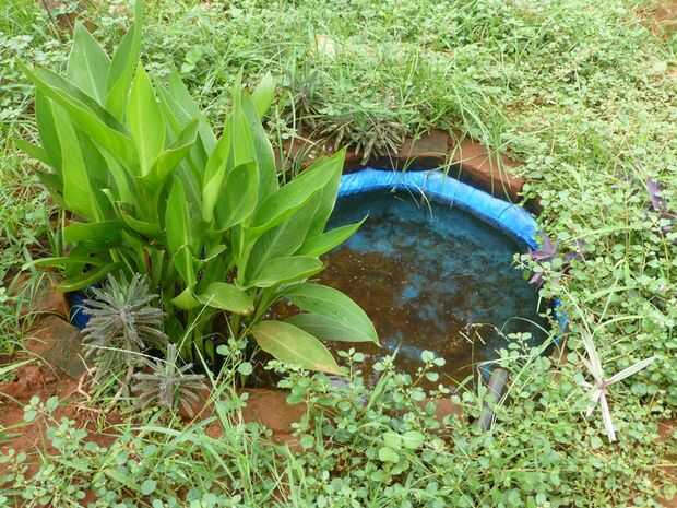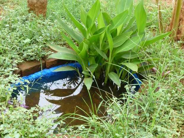 Es más de tres meses desde que construí este pequeño estanque en nuestro jardín. Los peces son felices y tengo pocos peces bebé también. He puesto una tubería permanente del agujero-pozo al estanque para el reciclaje de agua libre de cloro regularmente. La palma de coco cerca prospera con drenar el agua de la charca de pescados con residuos de pescado como fertilizante. No hay problema de algas también ya que el agua se cambia regularmente.