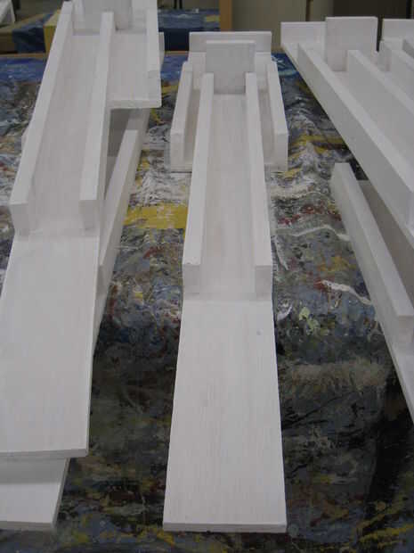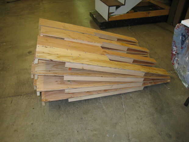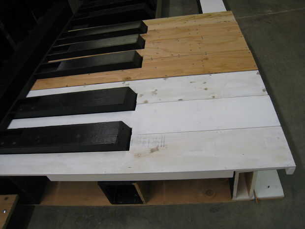 * Cada tecla debe reforzarse para manejar la carga juega. Una clave no reforzada se flexionará demasiado y probablemente rompería en uso. Finalmente había construido las teclas de madera contrachapada de 1/2" y había reforzada con listones de 3 o 4 a lo largo de las teclas. Con ese refuerzo (y soportes) las teclas pueden manejar a una persona de 200 libras que saltar sobre ellos.