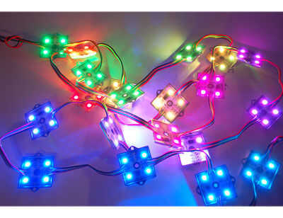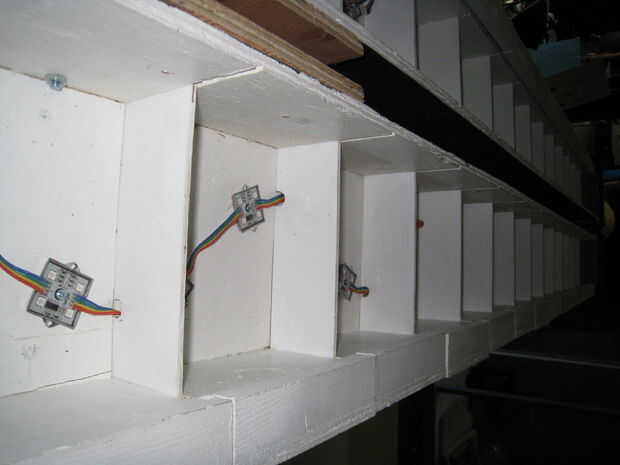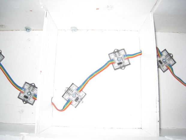 La tendencia hoy en día es utilizar LEDs en nuevas aplicaciones de iluminación, y esto no es una excepción. Queríamos luces de colores y queríamos ser controlable mediante un micro controlador. Un rápido estudio del mercado nos llevó a descubrir los módulos LED RGB individualmente controlables que pueden ser encadenadas juntas. El módulo que elegimos tiene 4 LEDs por módulo, y cada LED es un LED RGB. Es decir: es un LED rojo, verde y azul en un solo paquete. Cada módulo tiene un chip de controlador de LED que proporciona una sencilla interfaz digital para controlar el módulo. Existen 4 entradas a cada módulo: