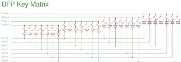 Personas han enfrentado a este problema en el pasado, y una solución común es la matriz de análisis. La idea clave es que queremos saber los Estados claves (arriba/abajo) pero no tenemos que saber en el mismo instante. Mediante la exploración de las teclas en el tiempo (aunque muy rápidamente en términos humanos) podemos reducir la cantidad de hardware que necesitamos.