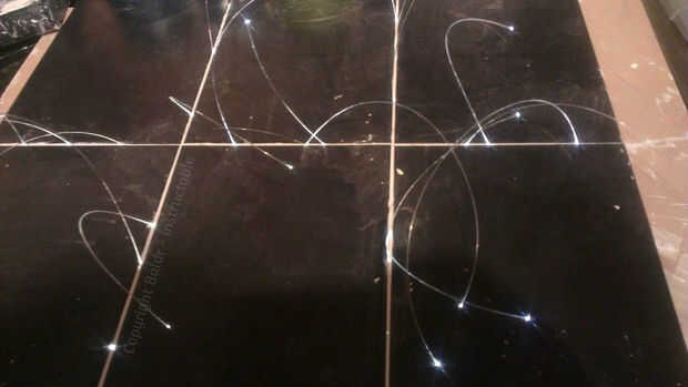 Dondequiera que quiere una estrella aparecer, pegue una fibra para arriba entre los azulejos. Utilicé cinta para sujetar la fibra aproximadamente en posición mientras que seguía poner azulejos más, aunque era sólo ligeramente efectivo y llegó despegarse - pero esto no importa tanto una vez hecho el azulejo siguiente. Trate de asegurarse de que la ruta de la fibra significa que cuando emerge, es perpendicular a la arista del azulejo, que tan verticalmente como sea posible. Esto significa que las fibras serán fáciles de ocultar, así como de la lechada y laicos.
