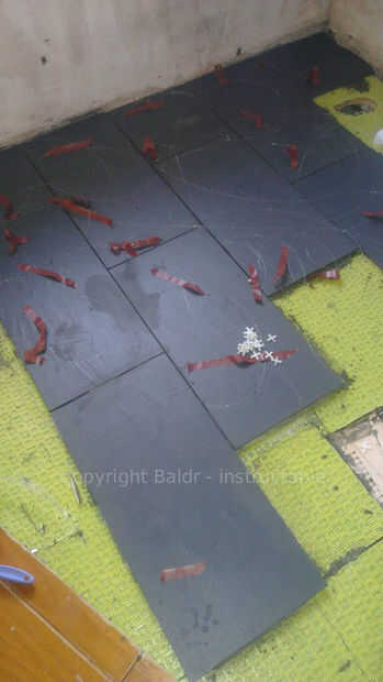 Una vez hecho el primer azulejo, levante todas las fibras y pelar detrás del camino, guardando espera de ellos (esto es donde encontré un amigo particularmente útil!). Adhesivo del piso para el azulejo siguiente. Pone cualquier fibras que se dirigen bajo el azulejo siguiente hacia abajo, cuidando de dejar un montón de suelo expuesto. Esto lo pone más fácil al llegar más lejos el paquete principal. Nos pareció más fácil de esparcir el adhesivo así, un azulejo a la vez, debido a la fiddliness de manejar también las fibras.