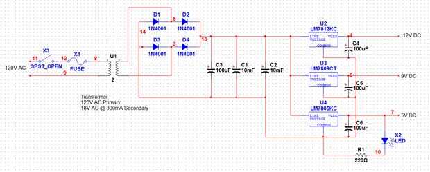 El esquema utiliza un circuito de alimentación simple conversión de AC a la C.C. que pulsa, suavizado con condensadores y corriente a través de reguladores de voltaje fijo DC salidas.