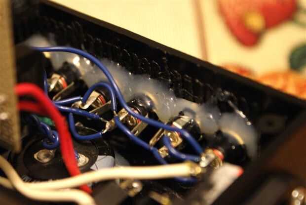 A continuación, poner alguna cinta eléctrica a través de los conectores de CC para que nada en el circuito puede tocarlos y cortocircuito. Las placas de metal en los reguladores están conectadas a tierra y se corta a cualquier cosa que toquen. La cinta también los pines de los condensadores y alrededor de las conexiones de 120 VAC para seguridad.