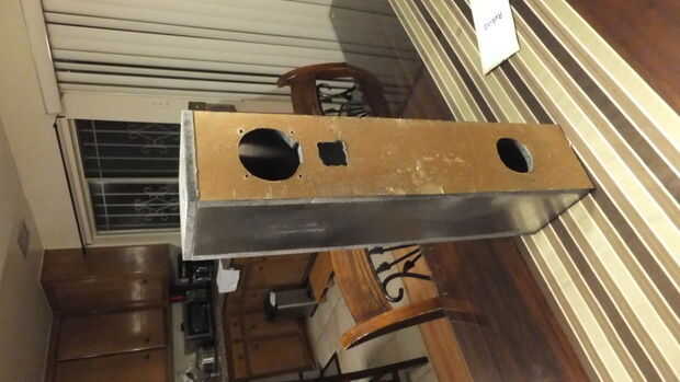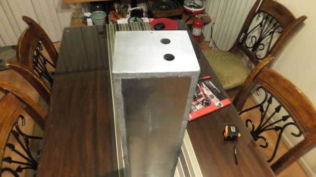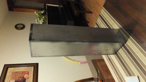 He creado 2 pies de alto, 5 pulgadas más amplia delantera y 6 pulgadas amplia lados del armario (que representa 1/4" de espesor de MDF). En este punto, usted no puede verlo, pero la lectura se divide en 2 secciones. La sección superior (porción más grande) es removible para trabajar en los componentes internos si es necesario y la sección inferior en permanentemente conectado y el jack de 3,5 mm y conector de alimentación va allí. Hay una plataforma en el gabinete donde se monta la emplaza con 2 secciones del amplificador.