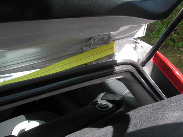 Para la fijación posterior, abrir el portón, ejecute las correas debajo de las bisagras pero deje las correas sueltas por ahora para que al cerrar la escotilla, la bisagra no scissor las correas (!). Las bisagras parecen lo suficientemente fuertes llevar la carga sobre la parrilla, que es baja en la dirección longitudinalmente.