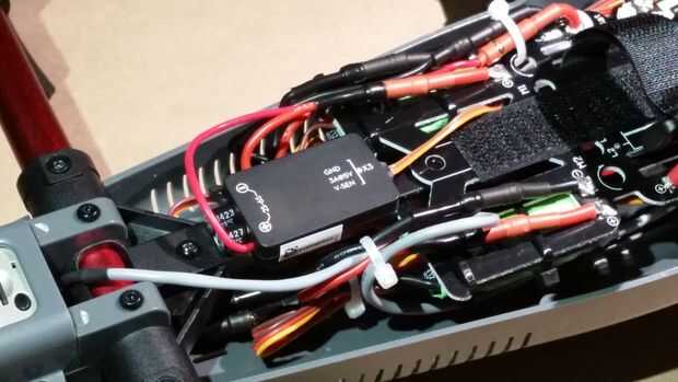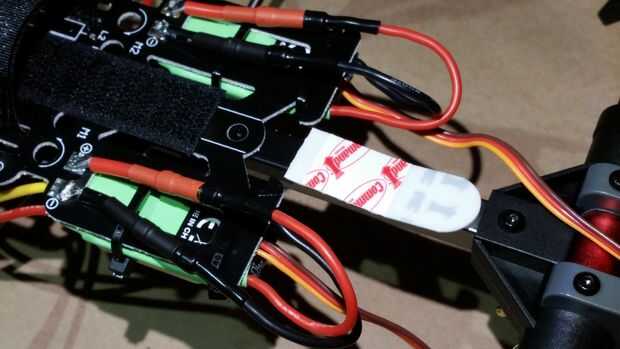 - Pegue la cinta de comandos al tubo central del quadcopter frente el tablero de distribución de energía.