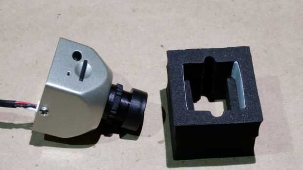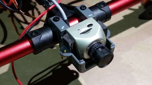 La cámara FPV obtiene montada, obviamente, en el muy delantero del chasis quadcopter. El titular de la cámara consta de tres partes: