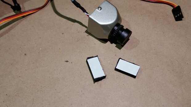 - Tomar una de las piezas de espuma no-pegajoso y en la parte delantera de la titular de la cámara conectada al chasis quadcopter.