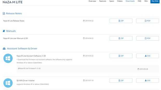 El controlador de Naza M Lite está disponible para descargar desde el sitio web DJI. Después de descargar el archivo, simplemente ejecute el .exe para instalar al controlador de Naza M Lite.