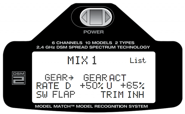 Vamos a conseguir miró fijamente cómo configurar nuestra combinación programable. La DX6i realmente puede programarse con dos mezclas, pero sólo necesitamos uno para hoy, así que en el menú principal, seleccione Mezclar 1. Inicialmente sólo verá una cosa en la pantalla, un acrónimo leyendo "Hab." Cambio y haga clic en este valor en "Acto" y verá todos los ajustes de mezcla aparecen. Configurar las opciones de acuerdo a la figura de abajo. Hay tres ajustes importantes aquí. En primer lugar, la primera línea de la configuración de las listas el swtich amo y el esclavo. La mezcla funciona cambiando el valor de la mezcla de esclavos cuando el amo mezcla cambios. En este caso, como hemos comentado anteriormente, el esclavo y el amo son el mismo interruptor para que el interruptor de marcha básicamente va a cambiar su propio valor. En segundo lugar, la opción D tasa determina cuánto para cambiar el valor cuando el interruptor está en la posición hacia abajo. Este es otro ejemplo del valor determinado a través de la experimentación, pero un valor del 50% funciona bien aquí. Último tenemos el campo SW. Esta configuración determina el conmutador se usa para encender y apagar la mezcla. Puede utilizar cualquiera de los switches en la DX6i, pero se utilizará el interruptor FLAP.