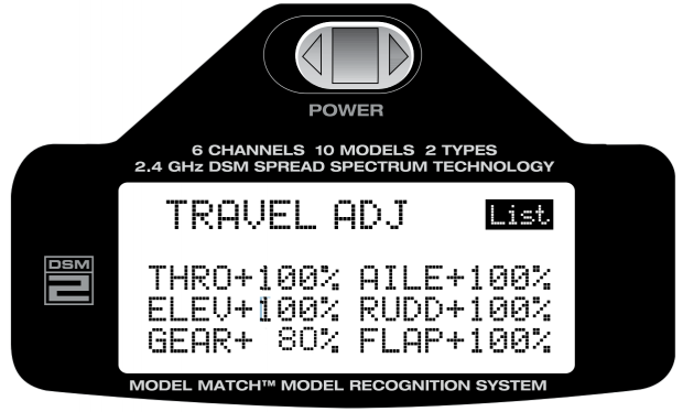 Esto lo haremos mediante la función Travel Adjust. Ajustar el recorrido de la función nos permite cambiar el rango entre los valores máximos y mínimos de un control. Eso es exactamente lo que queremos hacer aquí! Para comenzar con, asegúrese de girar el interruptor de velocidad hacia abajo (0). Ahora, toma un poco de experimentación figura números viables, pero en la pantalla de ajuste de recorrido del transmisor, reducir el ajuste de engranajes al 80%. Ahora regresa en el software del asistente de DJI y tratar de mover el interruptor de marcha hacia adelante y hacia atrás otra vez.