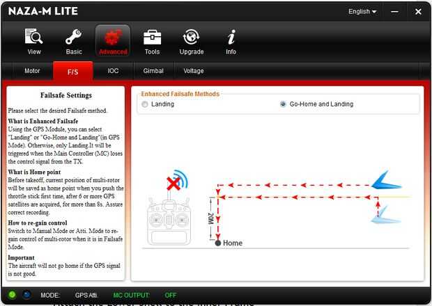 Ahora que entiendes el modo a prueba de fallos, vamos a configurarlo. El proceso es sencillo. En primer lugar, seleccione la ficha avanzado en la parte superior de la pantalla. A continuación, seleccione la sub-ficha F/S. Verá dos botones, uno para cada uno de los comportamientos de a prueba de fallos descritos anteriormente. Aterrizaje de modo significa el quadcopter flotar durante 10 segundo y luego la tierra. Significa modo de go-home y aterrizaje el quadcopter asomará durante 10 segundos, ascender a una altitud de 20 m, volar a la posición de inicio y luego la tierra. Puedes elegir cualquiera de estas opciones, pero generalmente seleccionar Go home y aterrizaje ya que es un poco más útil y yo no quiero cazar mi quadcopter si nunca pierdo la señal de radio (que no tengo).