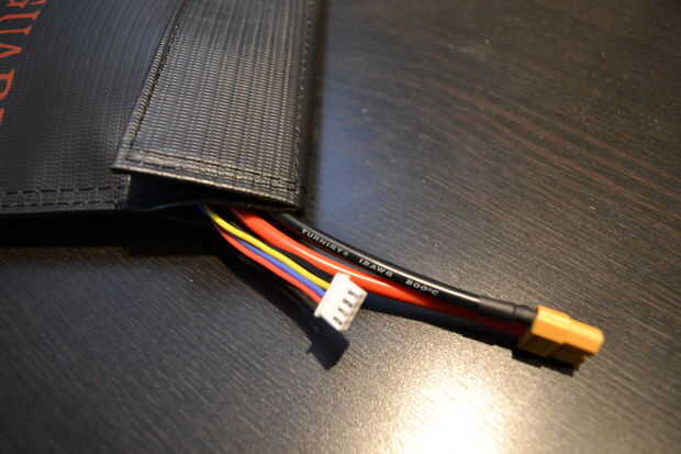 El primer paso es conectar la batería al cargador. Así, retire la batería del chasis quadcopter deshacer la correa de Velcro y luego levantando la batería de la tira de Velcro. Usted debe siempre Retire la batería de su quadcopter antes de cargarlo; por si acaso pasa algo loco, como la batería coge el fuego, definitivamente no desea su quadcopter todo para ir con ella. Echa un vistazo a la batería y te darás cuenta que hay dos conjuntos de cables que salen de un extremo: el conjunto rojo/negro grueso que utilizamos para conectar la batería para el quadcopter, y un sistema de cuatro colores más delgado los cables con un enchufe de fino al final. Se Conecte ambos conjuntos de cables en el cargador de Accucel-6.