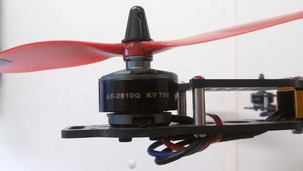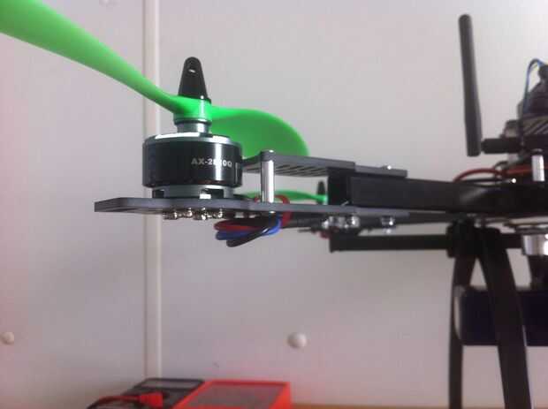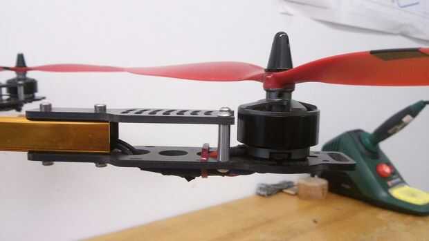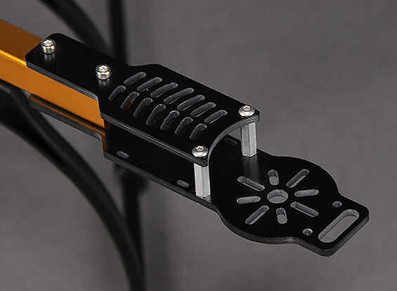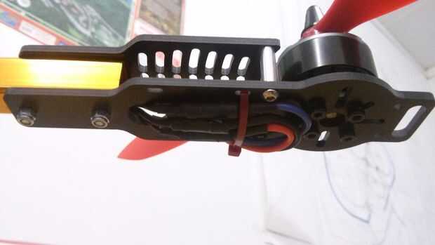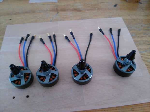 También montara todos los motores de cuatro en los soportes del motor correspondientes en el extremo de cada brazo. Es muy simple, sólo utilice los tornillos correctos (M3x6 mm), utilice una gota de pegamento de tornillo en cada tornillo. Mis motores vinieron sin conectores soldados, así que también había soldado enchufes de plátano macho de 3 mm y utiliza tubo del encogimiento del calor para proteger contra cortocircuitos. Una buena guía en video por Graysonhobby que muestra los fundamentos de la soldadura puede encontrarse aquí. La ESC viene con los enchufes de plátano hembra presoldered 3 mm en el extremo de cada cable del motor.