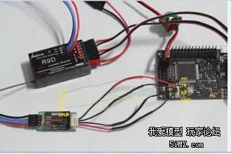- y escondido en el medio es el módulo de Radiolink PRM-02 OSD conectado al puerto R9D receptor de telemetría