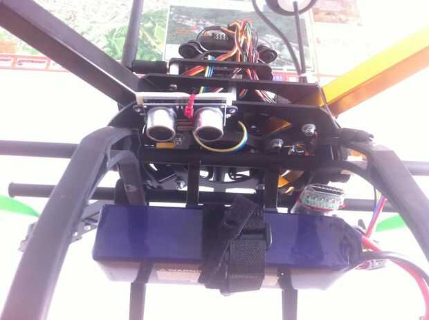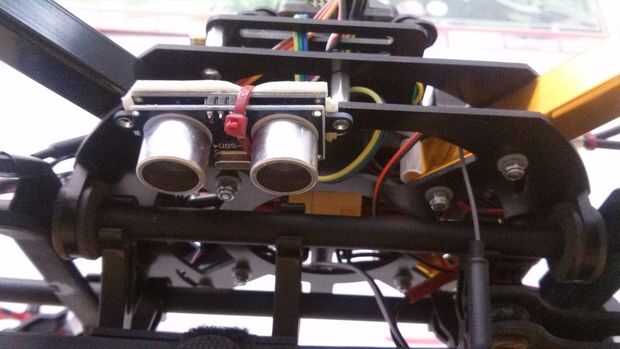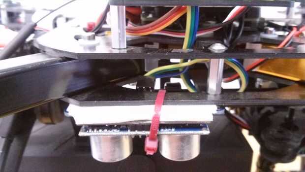 El lugar ideal para el sonar, está en la placa central del fondo, mirando hacia abajo a la derecha del quad. Había asegurado en su lugar con doble lazo cremallera y cinta echada a un lado. debe ser nivelado con el suelo y con "vistas" de la tierra, así que tren de aterrizaje o cardán no debe estar en el camino. Actúa simplemente rebote emitirá nuevamente el suelo y medir la respuesta de eco. Funciona muy bien entre 0,10 m y 5 m, hace el bajo vuelo muy estable y ayuda al quad para mantener la misma altitud en el modo suspender. Por encima de 5 metros se reemplaza por la APM construido en sensor de presión barométrica. Se alimenta de la APM, tan sólo guía el cable de la 3 línea para arriba a través de las placas centrales, conectarán más tarde a la APM.