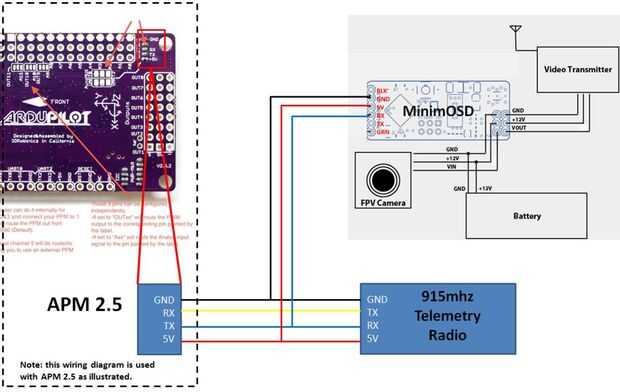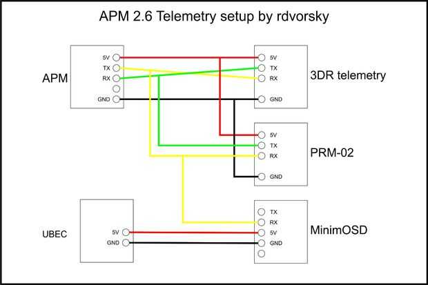 Nota no puede utilizar todas las posibilidades de conexión al mismo tiempo. El APM es capaz de comunicarse solamente con un módulo a la vez, porque sólo tiene un puerto de telemetría. Puede utilizar un cable Y conectar un módulo OSD en línea con un módulo de comunicación, pero eso es todo. Si se desea utilizar más módulos de comunicaciones de telemetría, tienes que cambiar a un controlador de vuelo más complejo como Pixhawk que apoyan más los puertos de entrada-salida telemetría simultáneamente. En mi configuración, utilizo el módulo Wi-Fi y el módulo de Radiolink PRM-02 OSD conectado con un divisor de cable Y. Yo uso el WiFi para conectar mi tablet Android usando Software de la torre y el PRM-02 transferencias información sobre estado del sistema importante para mi transmisor de radioenlace AT9. Cada módulo se lleva a cabo en lugar por doble caras lazos de cinta o zip. Más sobre la instalación y configuración de una conexión de la telemetría puede usted encontrar aquí.