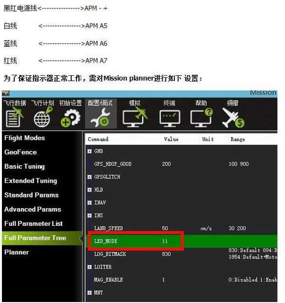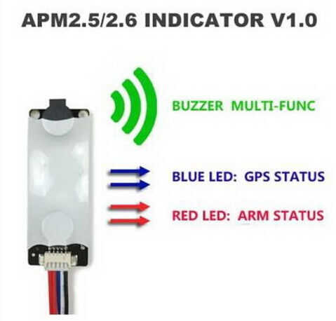Ahora para el módulo LED y timbre, aseguró en el interior de uno de los brazos traseros, un LEDs el cable a través de las placas a la APM, son 2 conectores, ésos según las instrucciones en los cuadros o en la Página Web de Arducopter conectar. Zumbador