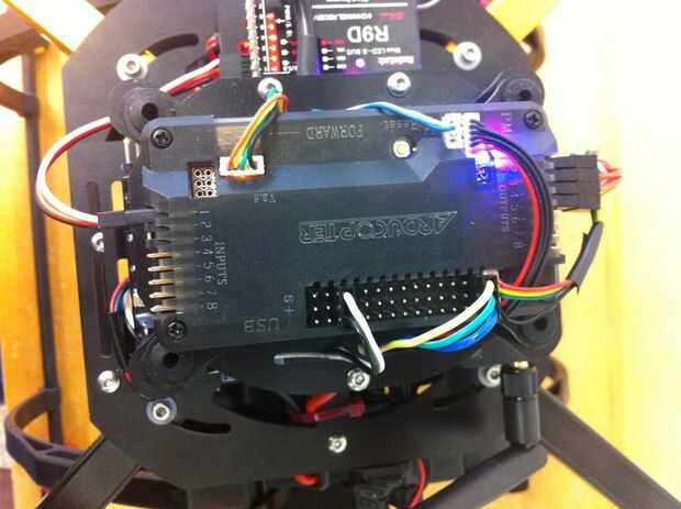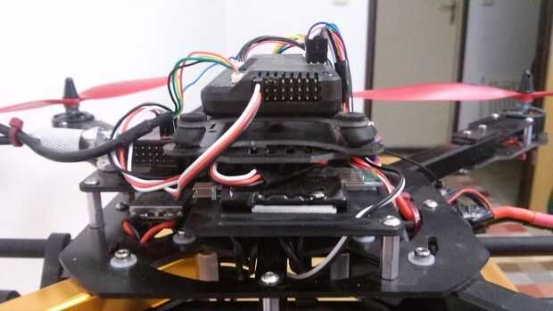 OK, ahora es el momento de instalar el nivel más superior de la estructura, donde será el controlador de vuelo. Es tan simple como atornillar en los últimos tres restantes pilares, con una gota de pegamento de tornillo. Ahora viene la plataforma anti-anti-vibración/amortiguación, asegurada en su lugar con cinta de doble cara. Elimina las vibraciones de los motores y hélices para no influir en el controlador de vuelo. Lo hacen bonito centro. Usted desea que el controlador de vuelo en el centro absoluto de los aviones no tripulados, es bueno para la estabilidad de vuelo, debido a la internas acelerómetros y giroscopios en el controlador de vuelo. Se puede ver claramente en que él fotos de cómo he instalado el APM sobre la plataforma de amortiguación. No te preocupes por la orientación de la APM, sin embargo, usted puede ver que lo instalé 90 grados a la izquierda contra el frente del marco, donde el soporte del GPS es. Puede establecer la orientación real en planificador de misión. Asegure el APM en su lugar con cinta adhesiva y otra vez, tratar de centrar. Más información sobre este tema aquí.