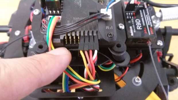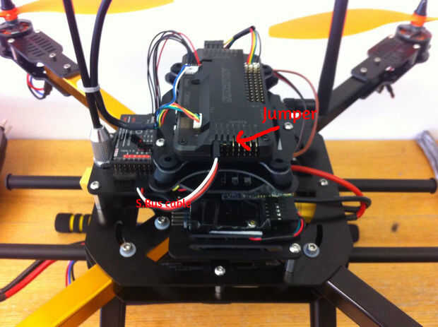 Ahora el receptor. En esta versión yo uso el protocolo de comunicación de Futaba S.Bus entre receptor y APM, wont entrar en detalles, solo sigan mi ejemplo, usted puede encontrar un montón de información sobre ella en la web si lo desea. Necesitamos a un solo cable del servo del 3 pin y un puente común utilizado en la PC. Ponga un extremo del cable del servo en el puerto de S.Bus del receptor y el otro extremo en el puerto de entrada 1 (canal 1) de la APM. Ver la polaridad, servo cables generalmente son color cifrado, así que usa blanco como señal (perno superior en la APM). Se puede ver en el cuadro n º 8. A continuación, inserte el puente común de PC en los pernos superior del canal 2 y 3, básicamente debe cortas la señal pins(top) del segundo y tercer canal en el lado de entrada de la APM. Esto dice el APM para cambiar el protocolo a S.Bus, donde todos los canales son transferidos a través de la línea. Menos cables, menos peso, más espacio y menos errores. Inserte el cable de 4 pines de la OSD de Radiolink PRM-02 en el puerto superior del receptor y se fijan. Más información sobre cómo conectar un receptor a la APM está aquí.