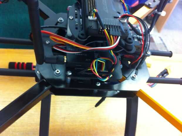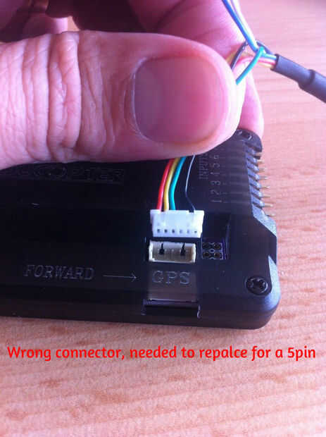 Ahora todos los cables. Yo necesita guiar a cada cable de nivel inferior a la plataforma superior, a través de las aberturas en la plataforma superior y en el puerto correspondiente en la APM. En primer lugar, instale el módulo GPS en el soporte. He utilizado cinta, simplemente debe asegurarse que la flecha en el módulo GPS está apuntando hacia delante, es la orientación de la brújula, y es necesario que el controlador de vuelo poder determinar la orientación y dirección correcta. Hay 2 conectores desde el módulo GPS, uno es un perno 4 I2C para el compás y el otro es un GPS que va en el orificio superior de GPS en el APM de 5 pines. En mi caso, el módulo GPS estaba equipado con un conector de 6 pines para el controlador de PixHawk, tuve que cambiar por un conector de 5 pines. Utilizar una brida para asegurar el cable al soporte. Si el cable es demasiado corto, deberás cortar un trozo del soporte GPS con una herramienta Dremel, para que no tire de la APM cuando se pliega hacia abajo. Usted puede leer más acerca de este tema aquí.