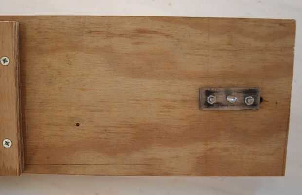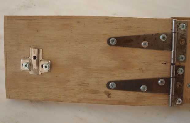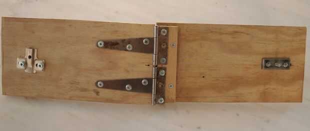 2. prepare la madera ángulo con la bisagra. Esto debe hacerse con cuidado. Configurar las placas de madera vertical sobre una superficie plana. Monte las bisagras en uno de ellos y la otra parte en el espaciador de madera. Primero use pegamento para fijar al espaciador en la otra placa y cuidar que ambas placas verticales en la superficie y presione uniformemente en él. Cuando el pegamento esté seco, fije la segunda placa con tornillos en el espaciador.
