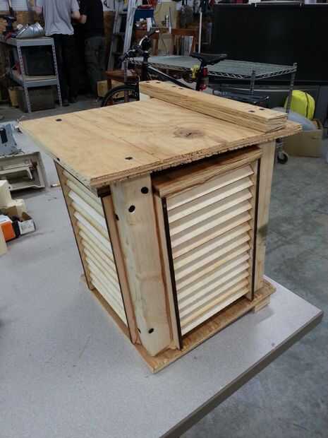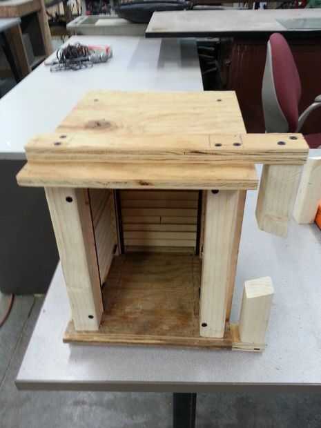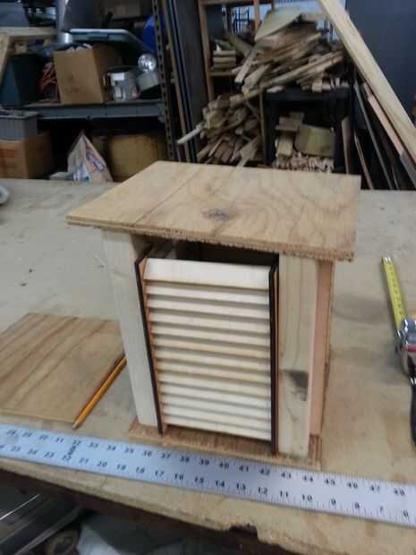 Además, ahora tendrá que pensar en cómo quiere que su gabinete se suspende en el aire. Para éste, se montará sobre un mástil de la antena. Corté unas tiras extras de madera para sujetar a la parte superior e inferior. Luego cortar algunas piezas extras de 2 x 2 y unido a mi las tiras de madera contrachapada. Este recinto se unirá al lado de un mástil de la antena usando abrazaderas. Ya que será la operación de una sola persona para arriba en la escalera, es más fácil que la manguera Abrazaderas ya conectadas alrededor del poste. Puedo deslizar sobre las piezas cortadas de 2 x 2 y apriete entonces abajo con una mano sostiene la caja y el otro girando el destornillador.