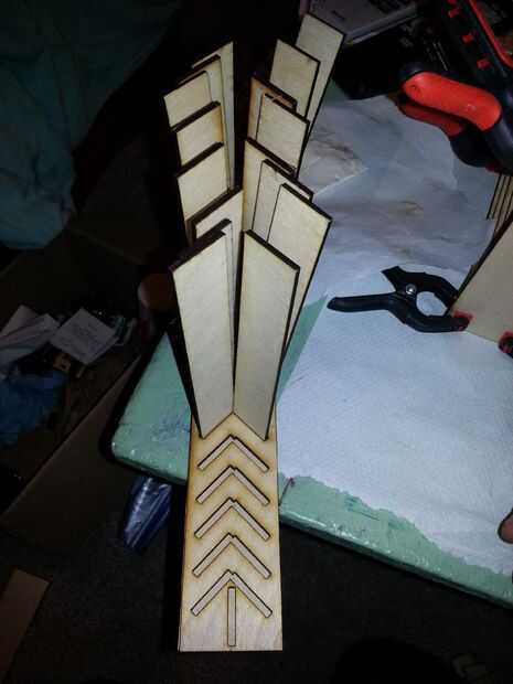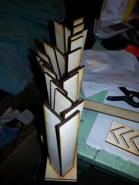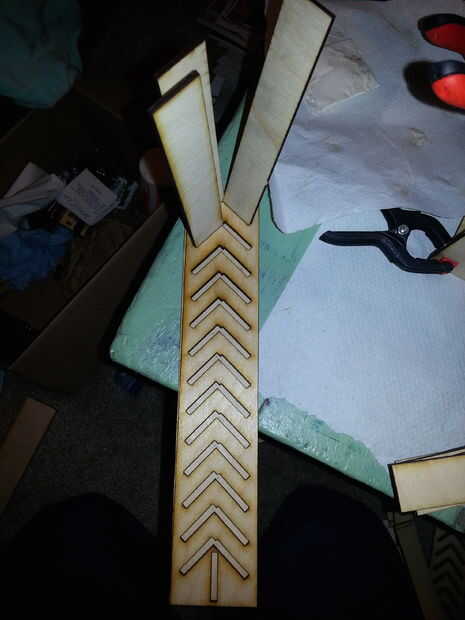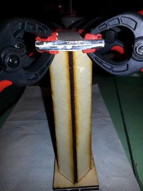 Encolado: colocar un par papertowels en su superficie de trabajo y extras para sus manos. Tomar el lado de louvre en blanco y cubrir con una capa liberal de pegamento para madera resistente al agua. Un poco de papertowel doblado yo solía manchar alrededor y cubre completamente el lado. Luego colóquela en la parte superior del lado como se muestra. Se deben utilizar abrazaderas o de lo contrario no se adherirá correctamente y los laterales tendrá un ancho irregular que condenará a su proyecto en la siguiente fase. Una vez que un lado sujetado, voltee la Asamblea y sentarse en las abrazaderas. Repita este paso en el otro lado de la Asamblea del louvre. Abrazadera de este lado también. Prefiero hacer ambos lados a la vez como puedo hacer correcciones a la Asamblea mientras el pegamento está aún húmedo. Deje la Asamblea secar durante 24 horas o lo que te dirige tu pegamento.