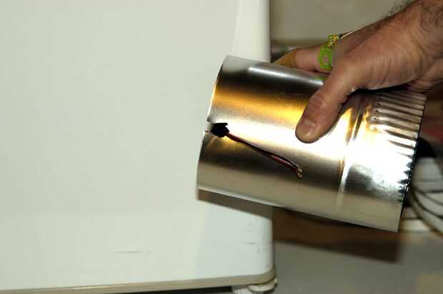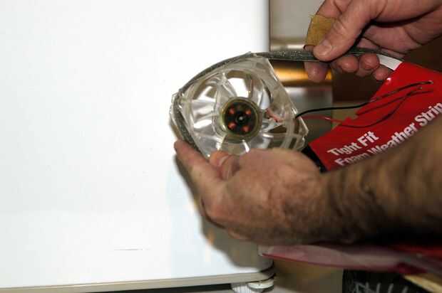 Ahora coloque los ventiladores dentro de los conductos de metal. Tuve que recortar las esquinas de los fans para que encajen. Tomar cierto aislamiento de la espuma (yo usé el tipo para sellar alrededor de las puertas) y enróllela alrededor de cuatro veces alrededor del borde exterior de la fan, luego ventilador de empuje dentro del tubo.