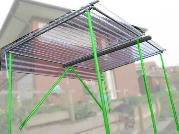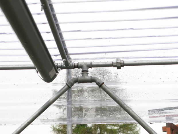 Pilar nuevo diagonal: hace un ángulo de 45 grados con los pilares de esquina posterior, con el fin de aumentar la estabilidad. Montar la t con los codos de 45 grados y las tuberías. Monte la t en el marco. Esta parte se podría simplificar seguramente.