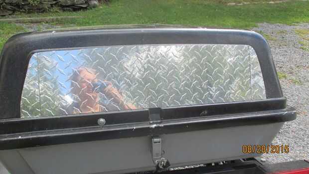 Hemos añadido ajuste---la parte trasera estaba un poco aburrida así que encontré una hoja de "Plato de diamante" en Artes de Michaels y cortar para caber--esto fue tal vez $10 y refleja cabeza luces y llama su atención durante el día.