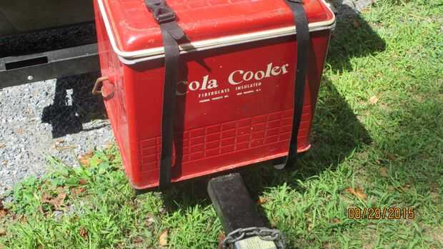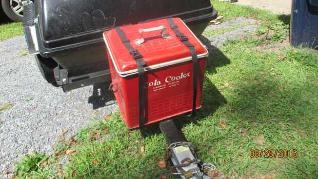 Encontré el enfriador en eBay y había soldada a un marco para él y había soldada a la lengua del remolque. Hemos estado encantados con el frío mantiene las cosas y que tiene un drenaje construido en. Acabo de terminar un viaje de semanas al sur y 100 + tiempo esto mantuvo nuestra materia fría. En el interior de la tapa se adhirieron dos de clara pequeño "bolsas de lápiz" ve en la tienda de dólar o Wally World; Salí de un borde abierto por lo que pude deslizar un cuchillo ahí en una funda de cuero. Para sujetarla se utilizaron correas de nylon y hebillas de empuje plástico; soldar anillos en "D" a mantener las tiras en su lugar que nos hemos dado cuenta que estas tienden a deslizarse en Hola velocidades forma sobre la parte superior del refrigerador así que vamos a añadir un "guardián" de la correa les. Con unos platos de plástico resistentes y algunos básico sacar utensilios más o menos podemos hacer un picnic o comer o por supuesto usted podría cocinar lo que llevaban.