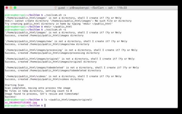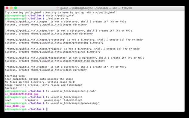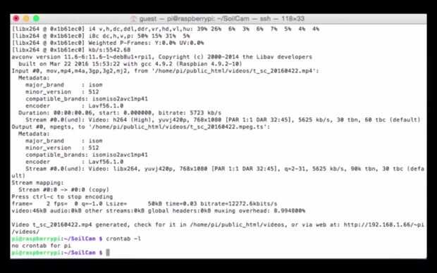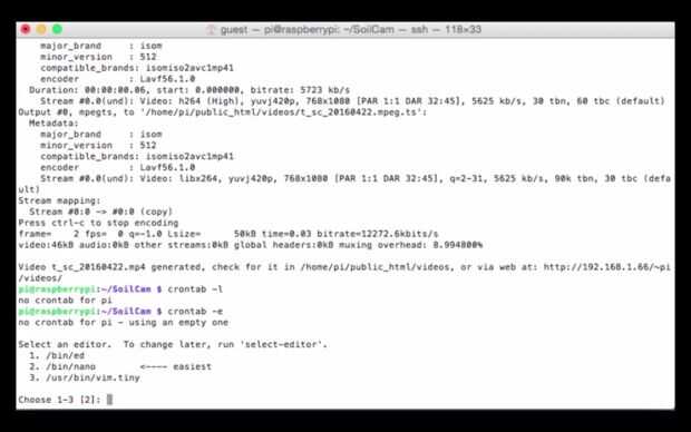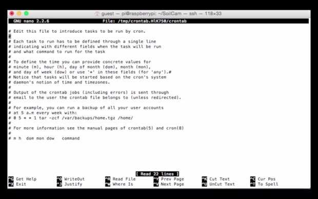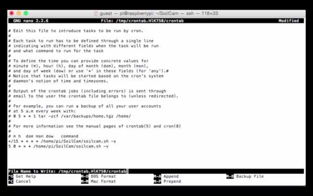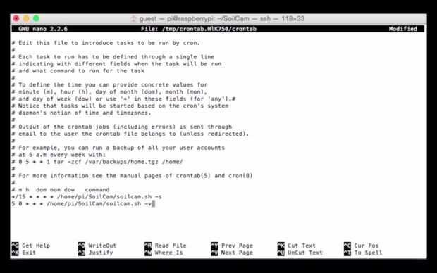- Tipo: * / 15 **** /home/pi/SoilCam/soilcam.sh -s