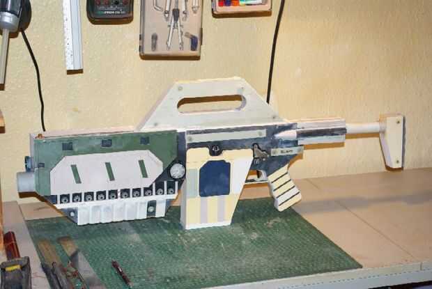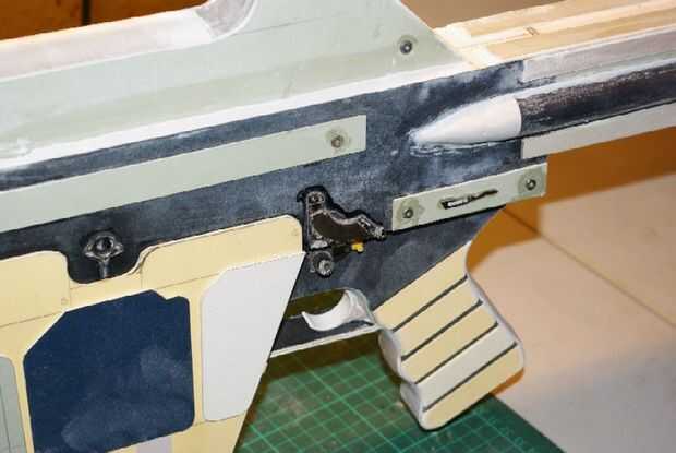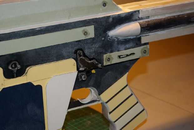 El gatillo fue agregado con un poco de corte de tubo de PVC y relleno, luego el guardamonte fue agregado mediante tiras de tarjeta.