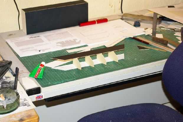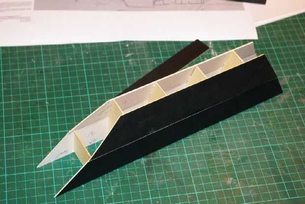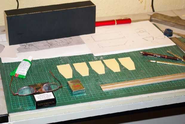 Empecé por cortar 5 apoyos internos a la forma que quería. Éstos entonces fueron pegados cuidadosamente a uno de los lados con una plaza para asegurarse de que fueran cierto. Entonces del otro lado estuviera pegado cuidadosamente en su lugar haber sido marcado a aceptar las llaves.
