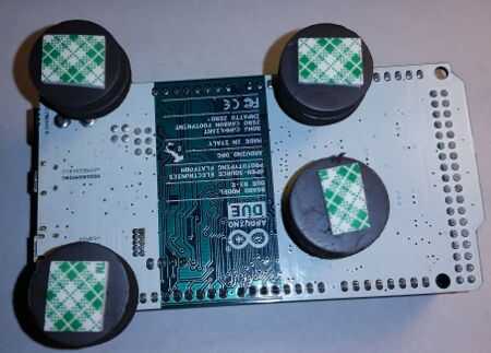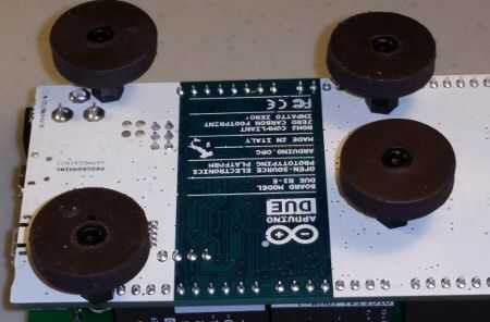 Si está usando los imanes colocar otro conjunto de imanes en los que se conectan a los separadores de la Arduino. Luego coloque cinta de doble cara en cada uno de ellos como se muestra en la imagen 3. Despegue la cinta copia de seguridad desde el lado abierto y empújela hacia abajo en el chasis donde desea montar el Arduino. Ahora debería poder rápidamente pop el Arduino y DynamixShield en y fuera de la estructura del robot.