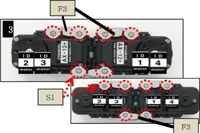 3. Ahora con cuidado coloque un marco de F3 en la parte superior de cada servo y asegúrelo con cuatro tornillos S1. Luego coloque el marco F3 restantes entre los dos servos y asegure cada lado utilizando cuatro pernos de S1 como se muestra en la figura 3.