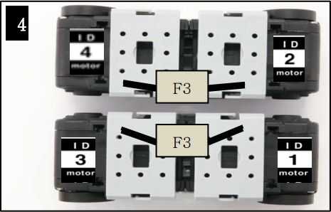 1. Vamos a empezar juntando las unidades de accionamiento. El robot utilizará cuatro servos Dynamixel en modo de rotación continuado para moverse. Tomar tres de las piezas del marco F3. En dos de los cuadros F3 colocar dos tuercas de N1 en los agujeros de la tuerca superior de la izquierda y derecha. En el tercer cuadro Coloque cuatro tuercas N1 en los agujeros de la tuerca superior e inferior, izquierda y derecha. Y para cada marco de F3 colocar dos soportes de cable F55 sobre la parte superior de las tuercas como se muestra en la primera imagen. Los soportes de cable evitará que las tuercas de caer hacia fuera cuando usted les asegure a los servos.