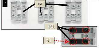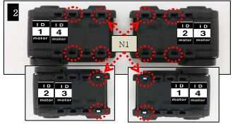 2. Para servos 1 y 2 lugar cuatro tuercas N1 en los agujeros de la tuerca en el lado como se muestra en la imagen. Luego coloque dos tuercas de N1 en los agujeros de la tuerca en el otro lado como se muestra en la segunda imagen.