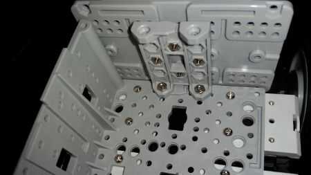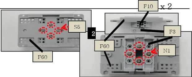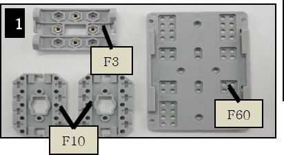 Ahora conecte la batería a la parte posterior del robot. Esto lo haremos usando el caso de 10 libras que viene con el Bioloid LiPoly batería y algunas otras piezas del marco. Se necesita dos partes de F10 y y F3. Lugar para N1 tuercas en un patrón de diamante en la parte posterior de la parte de F3 como se muestra en la primera imagen. Apilar las piezas F10 juntos y use cuatro pernos de S5 para unir estas piezas a la parte posterior del F60 de la batería. Una vez tiene las relacionadas a continuación, utilice dos S2 tornillos y dos tuercas de N1 para fijar la parte de F3 a la parte posterior del marco FP04 como se muestra en la tercera imagen. Usted tendrá que colocar entre los motores.