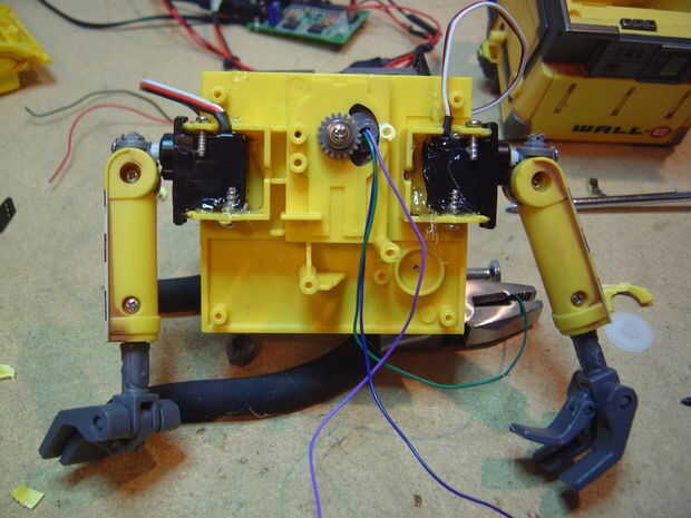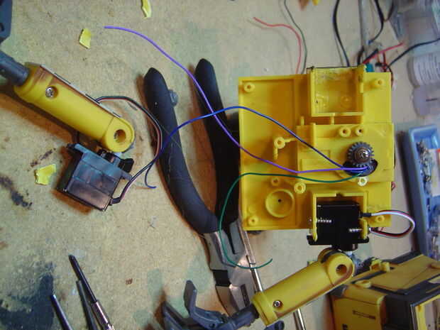 Montaje de los brazos de los servos es un poco complicado. No tengo una foto clara de cómo lo hice, pero ser creativo. Los paquetes de servo vienen con una variedad de brocas y extensiones. Sea creativo con esas extensiones. Tomé una extensión de 4 brazo y ajustado hacia abajo para que quepa dentro del brazo. Pegamento o tornillos no eran necesarios.