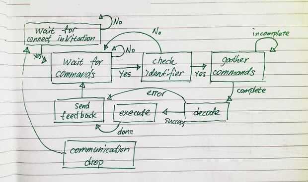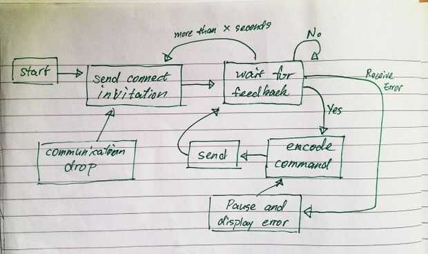 La programación del control remoto tiene un diagrama de flujo mostrado en la primera imagen. Es responsable de inicializar la conexión, restablecer la conexión rota, codificación de los comandos y proporcionar retroalimentación de cliente al usuario. También habrá un sistema de menú LCD para proporcionar información sobre el estado actual del controlador, permiten el ajuste de los parámetros en tiempo real, calibración y así sucesivamente.
