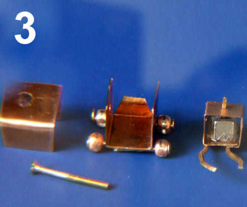 Usé. 005" espesor del bronce de fósforo del metal de hoja para el cuadro de estructuras porque puede soldarse y dousnt oxidar o manchar fácilmente. Podría utilizarse cobre o latón. Originalmente usé pequeñas brocas para perforar los agujeros del cojinete en la chapa para los ejes giratorios de alambre. Después de romper algunos de ellos en una prensa del taladro, terminé sólo perforar agujeros con una aguja grande y un martillo en la chapa. Esto crea un agujero de forma de cono que luego puedan presentarse plano. Los orificios no debe ser un tamaño exacto o incluso perfectamente colocan. En esta pequeña escala, las fuerzas friccionales son minutos y si te fijas bien en las fotos verás que utilicé durante mucho tiempo. 1" encabezado largo estándar los pernos que son cuadrados, de los ejes y los dedos de la pinza. También podría utilizarse el alambre de cobre.